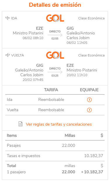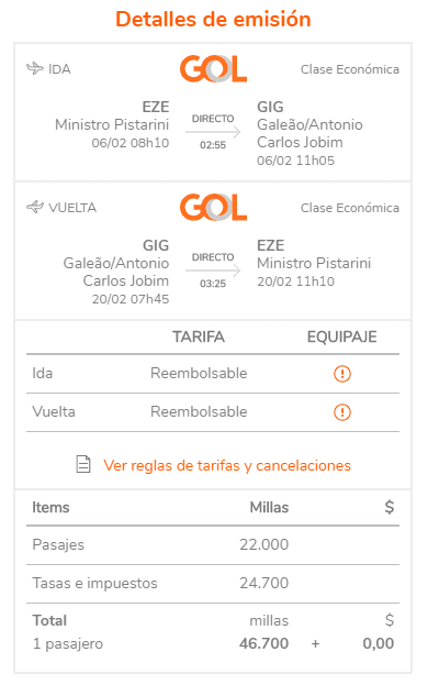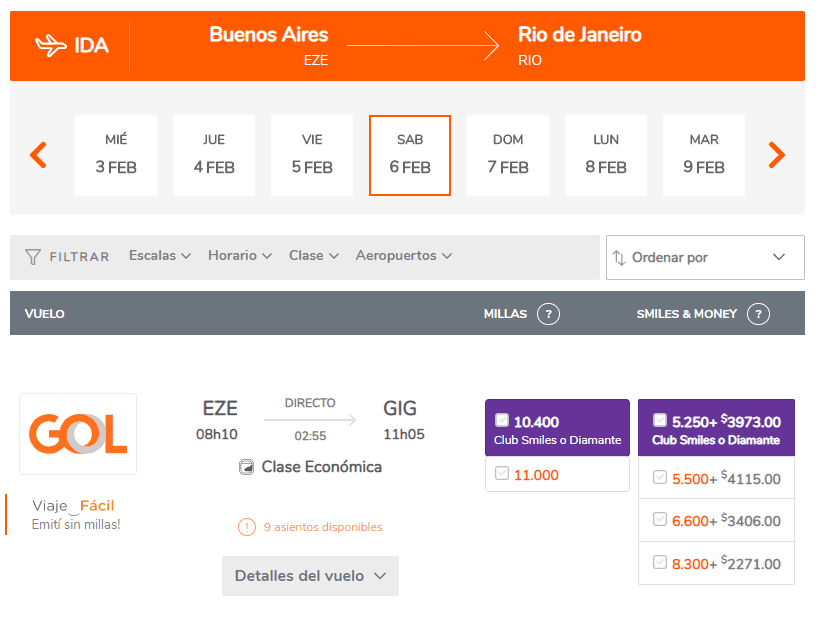 El costo en millas del tramo de Ezeiza (Buenos Aires) a Galeão (Rio de Janeiro) es de 11000 millas. En caso de estar suscrito al Club Smiles el costo en millas es de 10400 millas. También existe la posibilidad de pagar parte en millas y parte en efectivo. Eso es lo que se muestra en la columna de la derecha. Además del costo deben estar atentos a las escalas. Por ejemplo, para la opción seleccionada dice «DIRECTO» (sin escalas) y debajo el tiempo de vuelo. En este caso 2:55 horas.