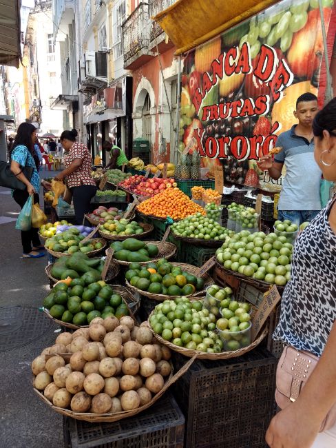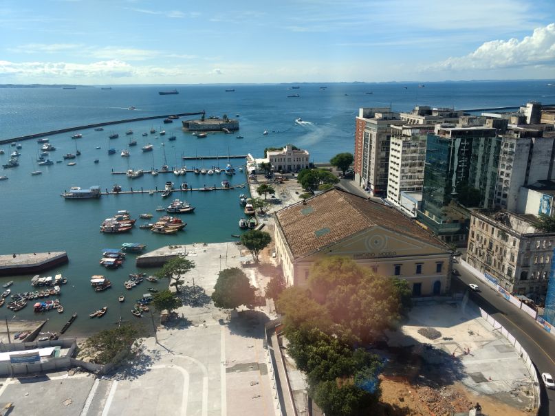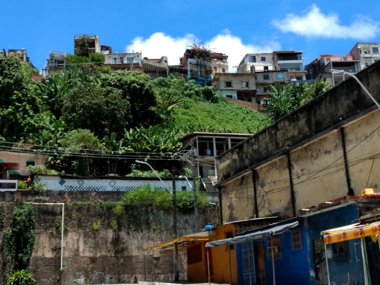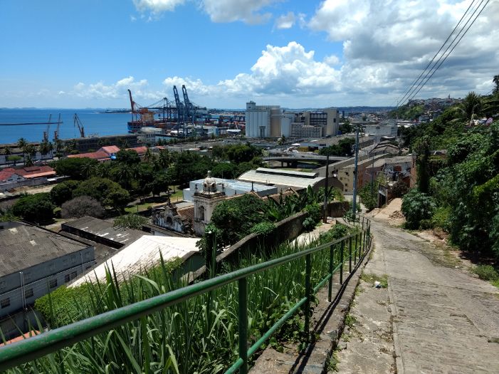 Conversé con unos ingleses que estaban con un mapa, les pregunté si sabían cómo llegar al Mercado Modelo. Fueron muy amables, conversamos unos minutos y seguí mi marcha. Tomé la Ladeira do Pilar una callecita estrecha que requirió algo de coraje para encarar, pero los viajes también necesitan su cuota de aventura. Seguí adelante. Llegué al final de la misma y el cambio de paisaje fue rotundo, pude ver el mar, grúas portuarias, y la calle en bajada me invitaba a transitar un lugar ya poco urbano. Sentí un poco de miedo, pensé ¿adónde me estoy metiendo? Decidí seguir.