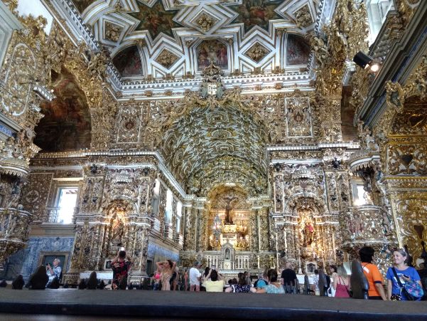 Pelourinho es Dr. Jekill y Mr. Hide, de día es una cosa y de noche otra. A la mañana siguiente vi con mejores ojos todo, vi gente feliz. Es cierto también que la tercera Devassa ayudó a ser más condescendiente. Salvador fue la primera capital de Brasil (hasta 1763). Pelourinho era el nombre que se le daba a la piedra adonde se sujetaba a los esclavos para castigarlos y también el nombre del barrio que otrora supo ser de lujo, hasta que desde mediados del siglo pasado comenzó una franca decadencia. Existe desde 1549 y su ubicación fue considerada estratégica ya que se encuentra muy elevado respecto al nivel del mar, pero cerca de la playa. Está separado por una especie de acantilado, lo que le otorgaba una defensa natural. Pelourinho tiene una iglesia cada 50 o 100 metros, construidas con distintos estilos. Imagino que debe ser la mayor concentración de iglesias por metro cuadrado del mundo (quizás una buena explicación para comprender la decadencia de la ciudad). Se destaca la de São Francisco por su pomposidad en una excesiva ornamentación de oro, casi obscena. Considerando la decena de indigentes que se ve en la calle, como mínimo, no deja de llamar la atención tal contraste.