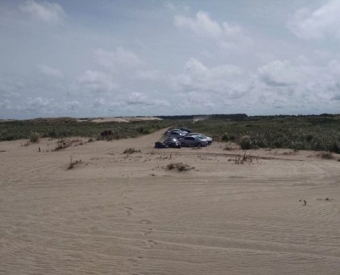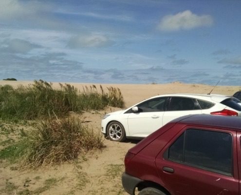 Entre la playa y las dunas hay mucho movimiento de autos, camionetas, cuatriciclos, etc., parece una calle. Permanentemente se ve pasar curiosos, tanto desde los autos, como caminando por la playa. El caso más extremo que vi fue el de un señor que, junto con su esposa, estacionaron su camioneta justo al límite de la playa, pero estando del lado textil. Y eso que la playa es realmente muy amplia…