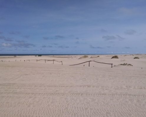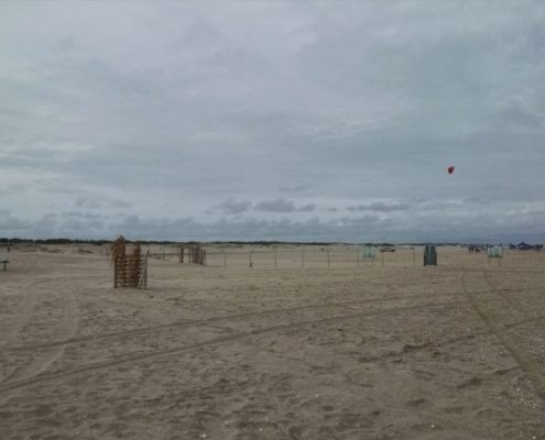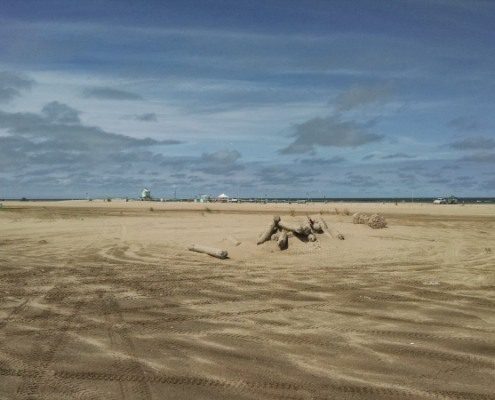 Cuando visité la Playa Querandí, hace un tiempo, habían construido una barrera visual hecha con madera y juncos secos. Quedaba muy bien y era muy útil. Evidentemente la dureza del clima del lugar sólo dejó en pie la estructura, que sirve para delimitar la playa, pero no como barrera.