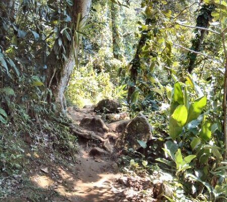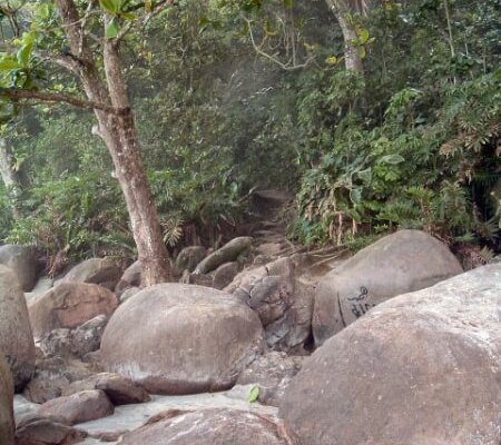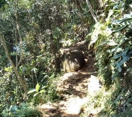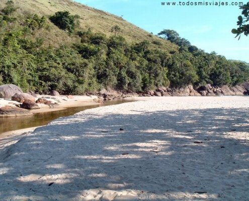 Luego de caminar durante algunos minutos el sendero se divide en dos, hacia la izquierda se va a una cascada (cachoeira en portugués) y hacia la derecha a la praia Brava.